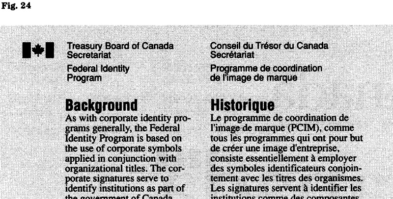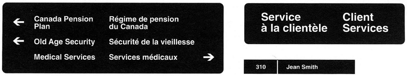 Identification, recognition and access are aspects of both corporate identity and service to the public. The clear and consistent identification of an institution helps the public to find and access programs and services. This means applying corporate signatures and organizational titles in a coherent manner and ensuring that the identification is functional and user oriented. Integral to the government's policy on corporate identity and service to the public is the principle of presenting the two official languages with equal prominence. Design standards help to ensure a uniform presentation of the two languages.