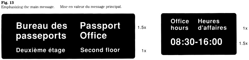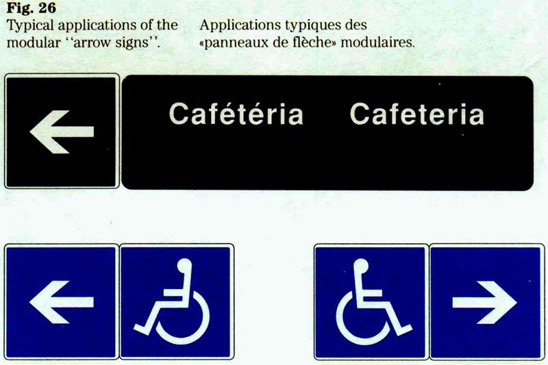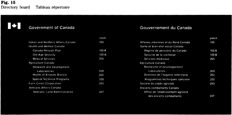 Signage is a concrete example of how service to the public can be enhanced through communications systems and design standards. The FIP signage system is designed to help people find a government facility and locate a particular service or office within. Comprised of primary identification signs, directory boards, directional and locational signs, the system is being applied in federal buildings, regional and district offices, employment and immigration centres, passport offices, customs and taxation offices, ports of entry, health services facilities, schools, museums, passenger terminals and national parks.