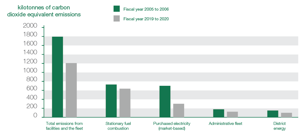 - The federal facilities and conventional fleet emissions for fiscal year 2024 to 2025 totaled 1,024 kilotonnes (kt) of carbon dioxide equivalent (CO2 eq), which represents a decrease of 757 kt CO2 eq or 42.5% (excluding National Safety and Security emissions), compared with fiscal year 2005 to 2006