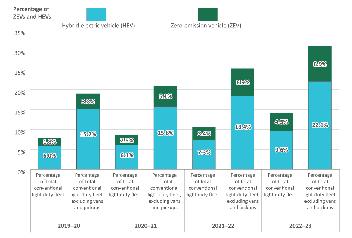 | Fiscal year | Hybrid-electric vehicles as a percentage of the total conventional light-duty fleet | Hybrid-electric vehicles as a percentage of the conventional light-duty fleet, excluding vans and pickups | Zero-emission vehicles as a percentage of the total conventional light-duty fleet | Zero-emission vehicles as a percentage of the conventional light-duty fleet, excluding vans and pickups |