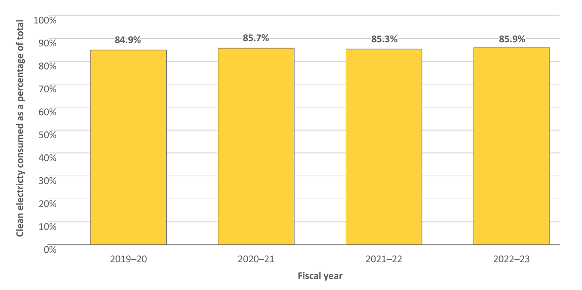 - The proportion of clean electricity consumed by the Government of Canada as a percentage of the total electricity consumed increased to 87% in 2023-24. Much of the increase can be attributed to increased procurement of renewable electricity certifications from new generation in Saskatchewan. This number will continue to increase as in-process clean electricity procurements in multiple jurisdictions are completed and new generating facilities come online.