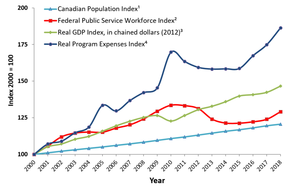 Figure 1 shows trends in the economy, the Canadian population, real federal program spending and the size of the federal public service, from 2000 to 2018.
