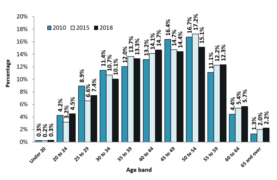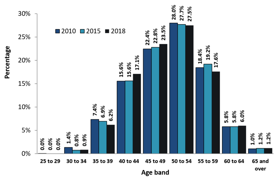 Figure 12 shows the age breakdown of federal public service executives for 2010, 2015 and 2018. The average age of executives in the federal public service remained relatively unchanged between 2010 and 2018, at 50.2 years of age. The proportion of executives under 50 years of age remained relatively constant between 2010 and 2018, at approximately 46.7% and 47.6%, respectively.