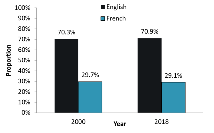 - 29.1% indicated French as their first official language (29.7% in 2000)