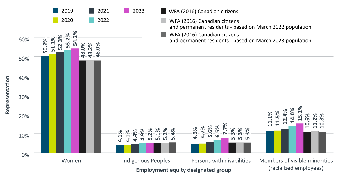 In 2023, the core public administration representation levels for women, persons with disabilities and members of visible minorities in the executive category exceeded their respective workforce availability, while representation of Indigenous Peoples fell short of their workforce availability.