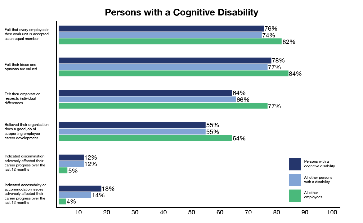 Figure 10: Results for persons with a cognitive disability compared with results for all other persons with a disability and all other employeesFigure 10 - Text version