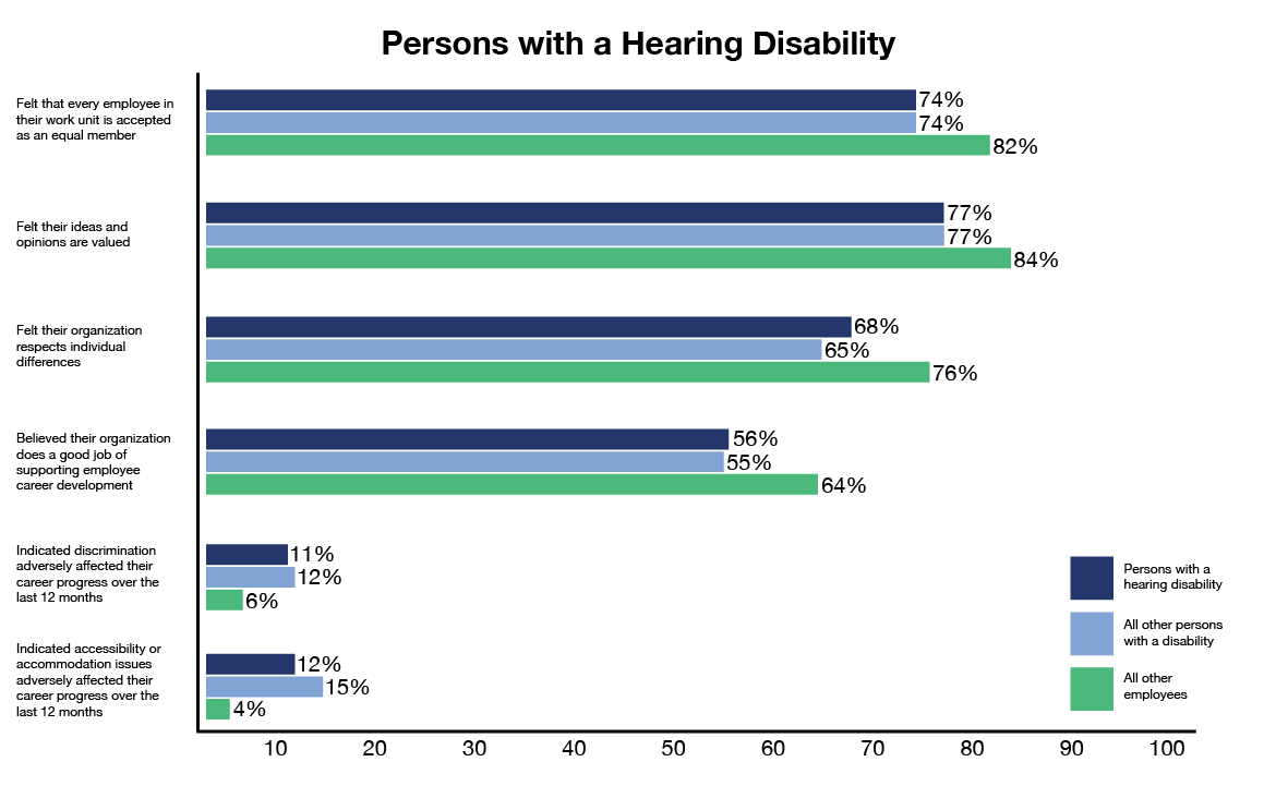 Figure 3: Results for persons with a hearing disability compared with results for all other persons with a disability and all other employeesFigure 3 - Text version