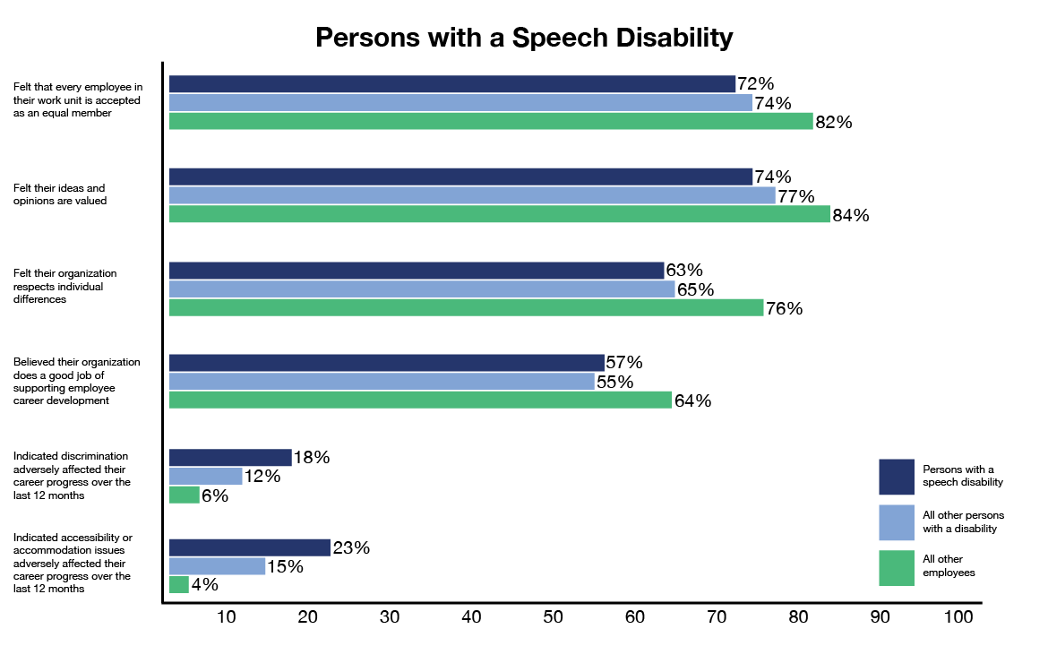 Figure 4: Results for persons with a speech disability compared with results for all other persons with a disability and with all other employeesFigure 4 - Text version