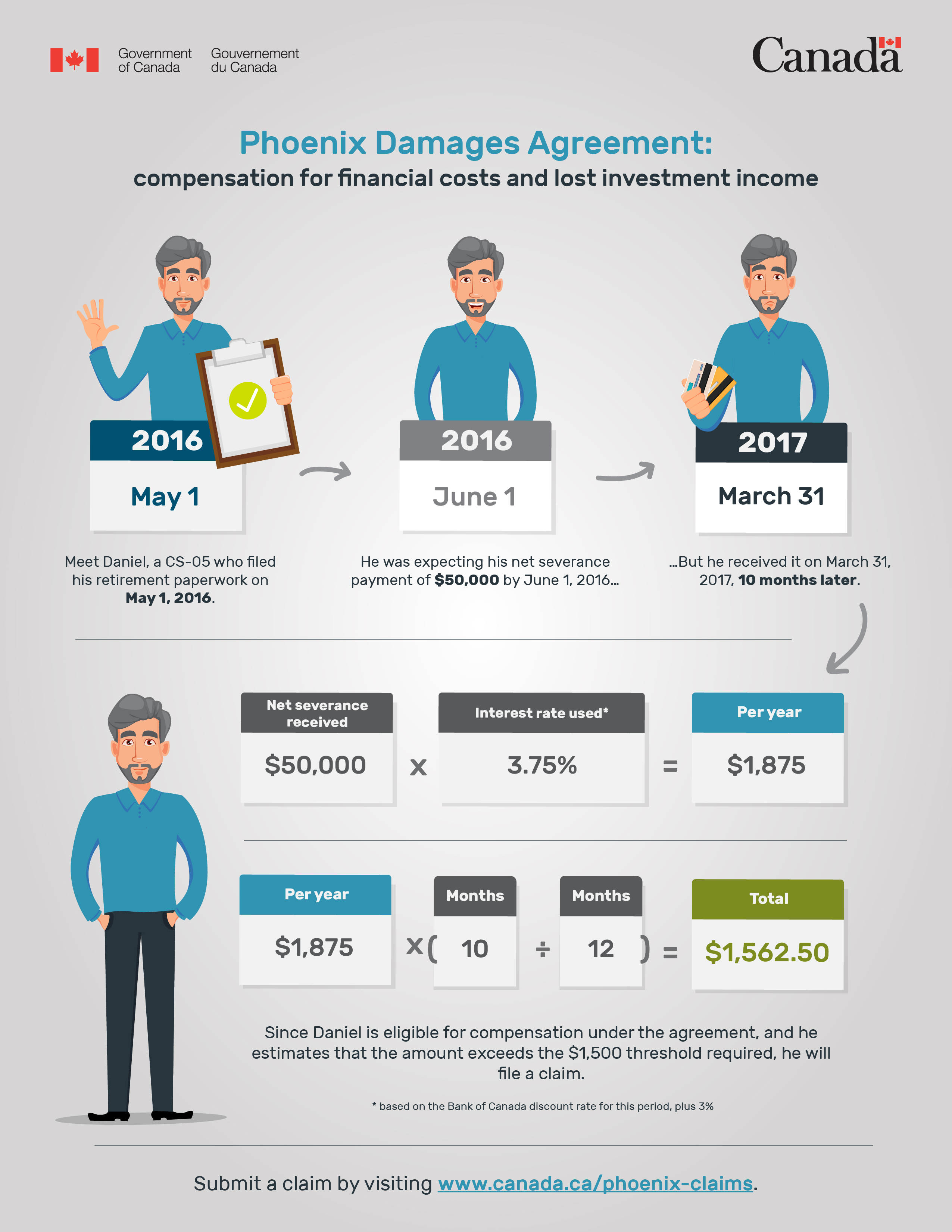 The amount of compensation Daniel is entitled to is calculated using the average Bank of Canada discount rate from the previous month plus 3% and is based on ten months where the time to issue the payment exceeded the normal established processing timelines. The eligible compensation is $1,562.50.