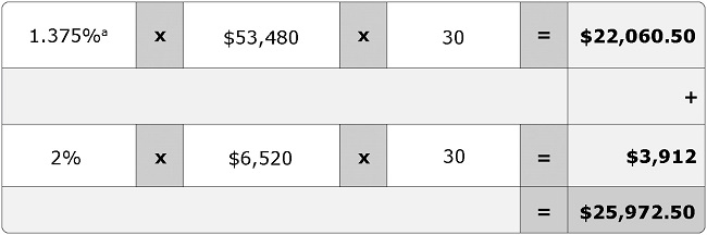 1.375 percent multiplied by 45,000 dollars multiplied by 30 equals 18,562.50 dollars
