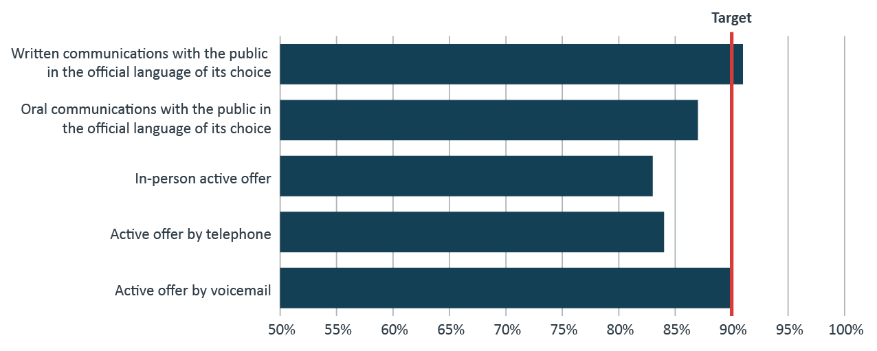 Written communications with the public in the official language of its choice: 91%; oral communications with the public in the official language of its choice: 87%; in-person active offer: 83%; active offer by telephone: 84%; active offer by voicemail: 90%, with a target of 90%