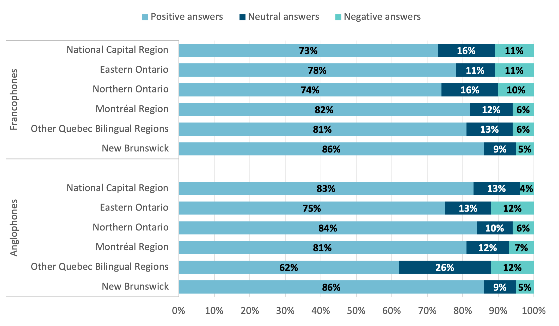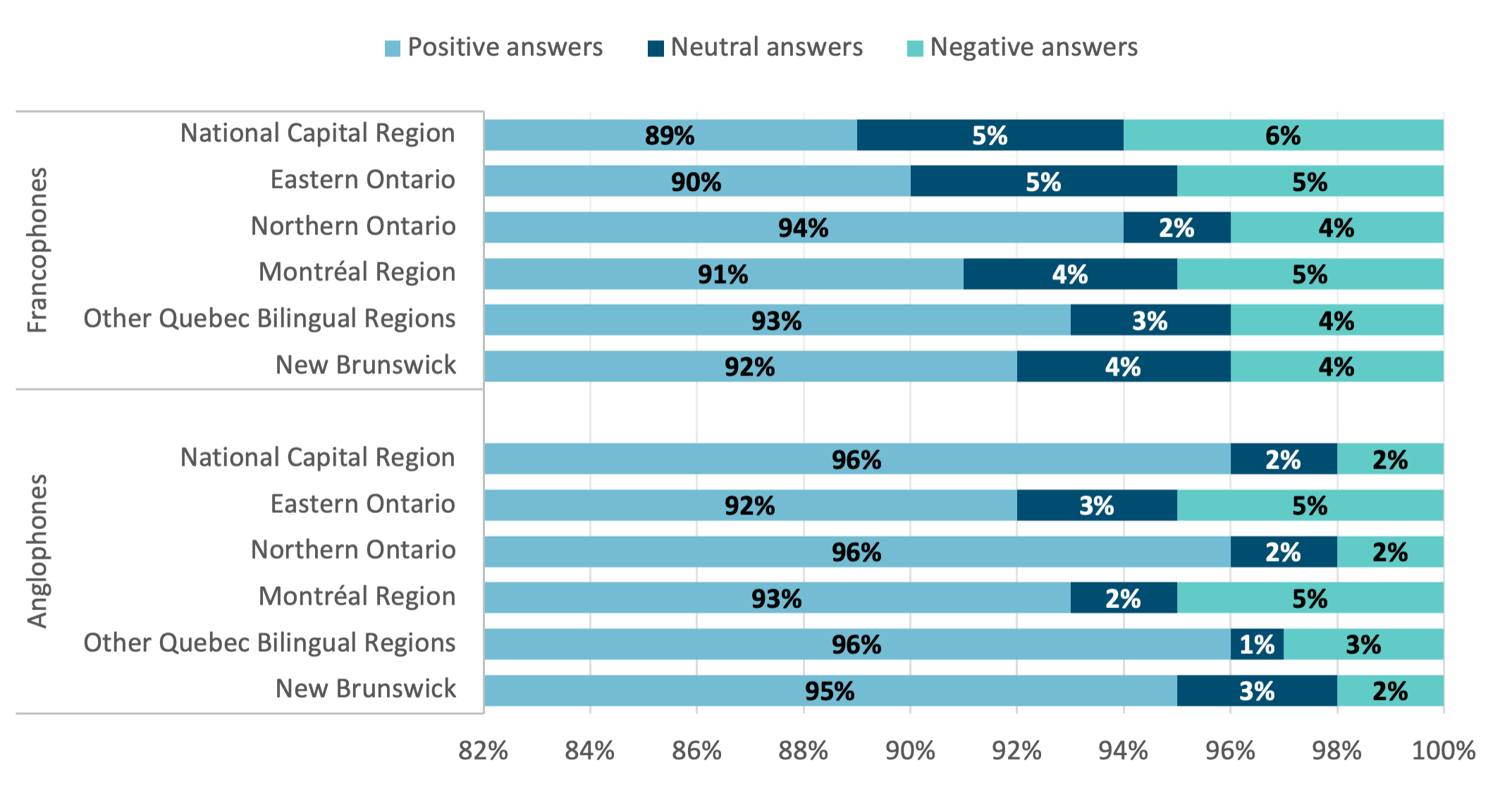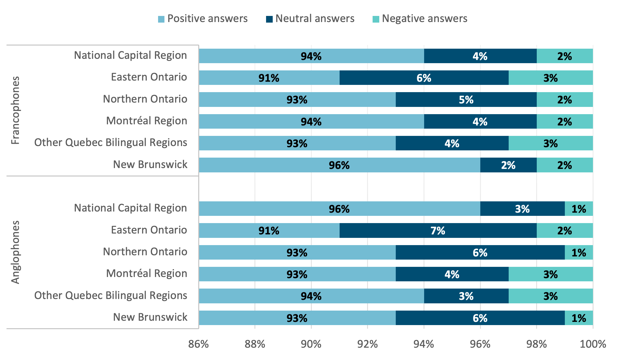 As of March 31, 2021, Newfoundland and Labrador had the highest percentage of Anglophones (98.5%) and Quebec (excluding the National Capital Region) had the highest percentage of Francophones (82.3%) working in all institutions subject to the Official Languages Act.