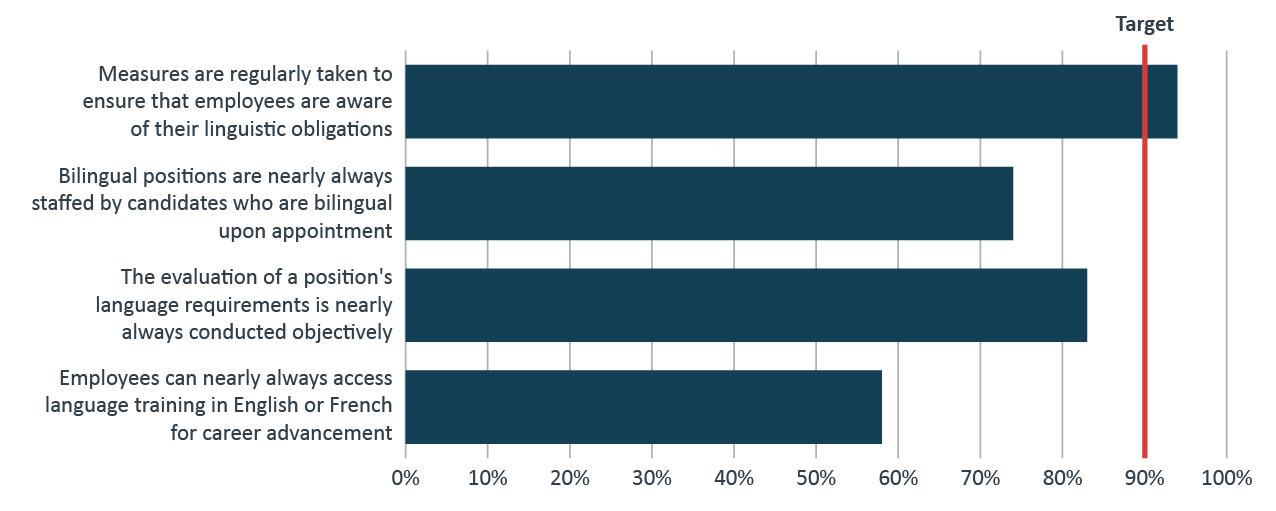 The Act provides that federal institutions must ensure that the information or services provided by a third party on their behalf to members of the public are indeed provided in the official language preferred by members of the public. Federal institutions do not always do so. In fact, only 76% ensure that contracts and agreements with third parties acting on behalf of bilingual offices nearly always include clauses that set out the language obligations that these third parties must meet. This situation has remained virtually unchanged since 2015–18, when the proportion was 75%.