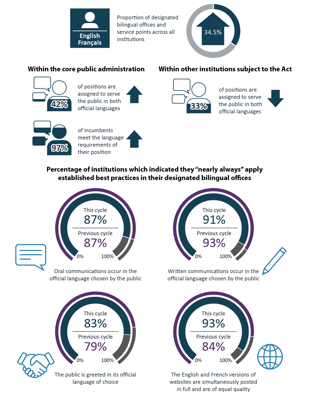 Proportion of designated bilingual offices and service points across all institutions: 34.5%, a trend on the rise