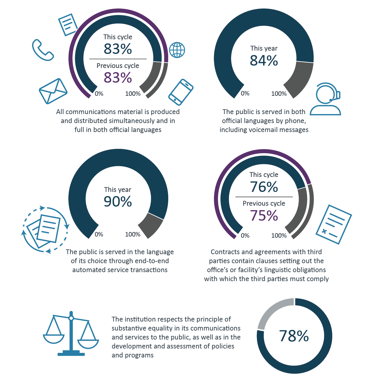 Contracts and agreements with third parties contain clauses setting out the office’s or facility’s linguistic obligations with which the third parties must comply: this cycle, 76%; previous cycle, 75%