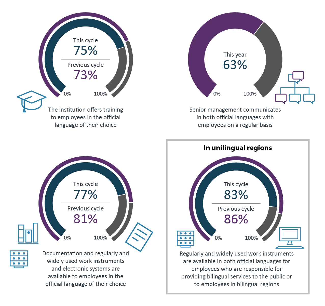 The data presented in this report, unlike those presented in previous reports, cover a three-year cycle and all federal institutions, rather than a single fiscal year (for example, 2020–21) and only those institutions required to submit a review in that year. In some cases,Footnote 2 the data can be compared with the data gathered by TBS for the 2015–18 cycle to determine whether a particular situation (such as the use of both official languages in meetings in federal institutions) has improved, remained stable or deteriorated.