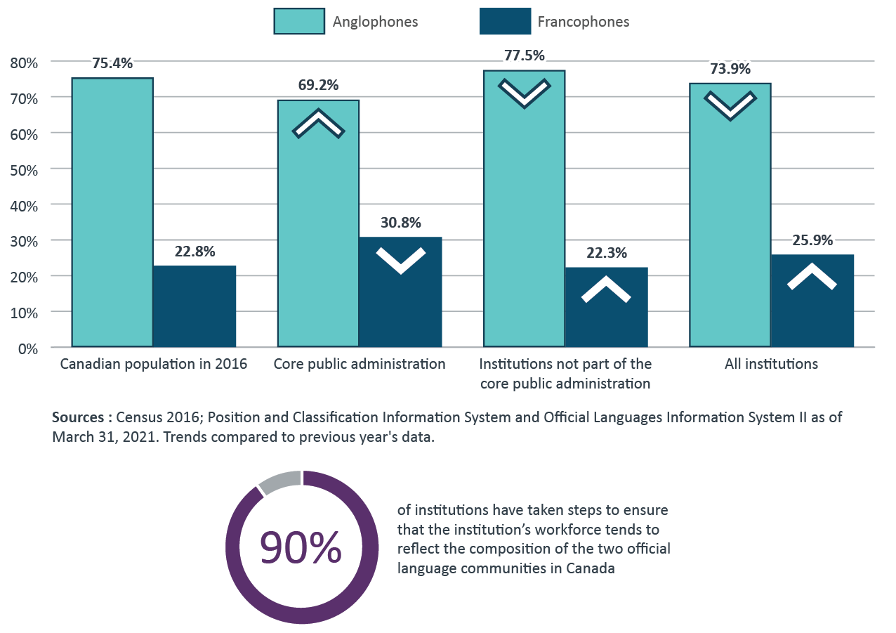 As of March 31, 2021, Newfoundland and Labrador had the highest percentage of Anglophones (98.2%) and Quebec (excluding the National Capital Region) had the highest percentage of Francophones (79.3%) working in institutions that are not part of the core public administration.