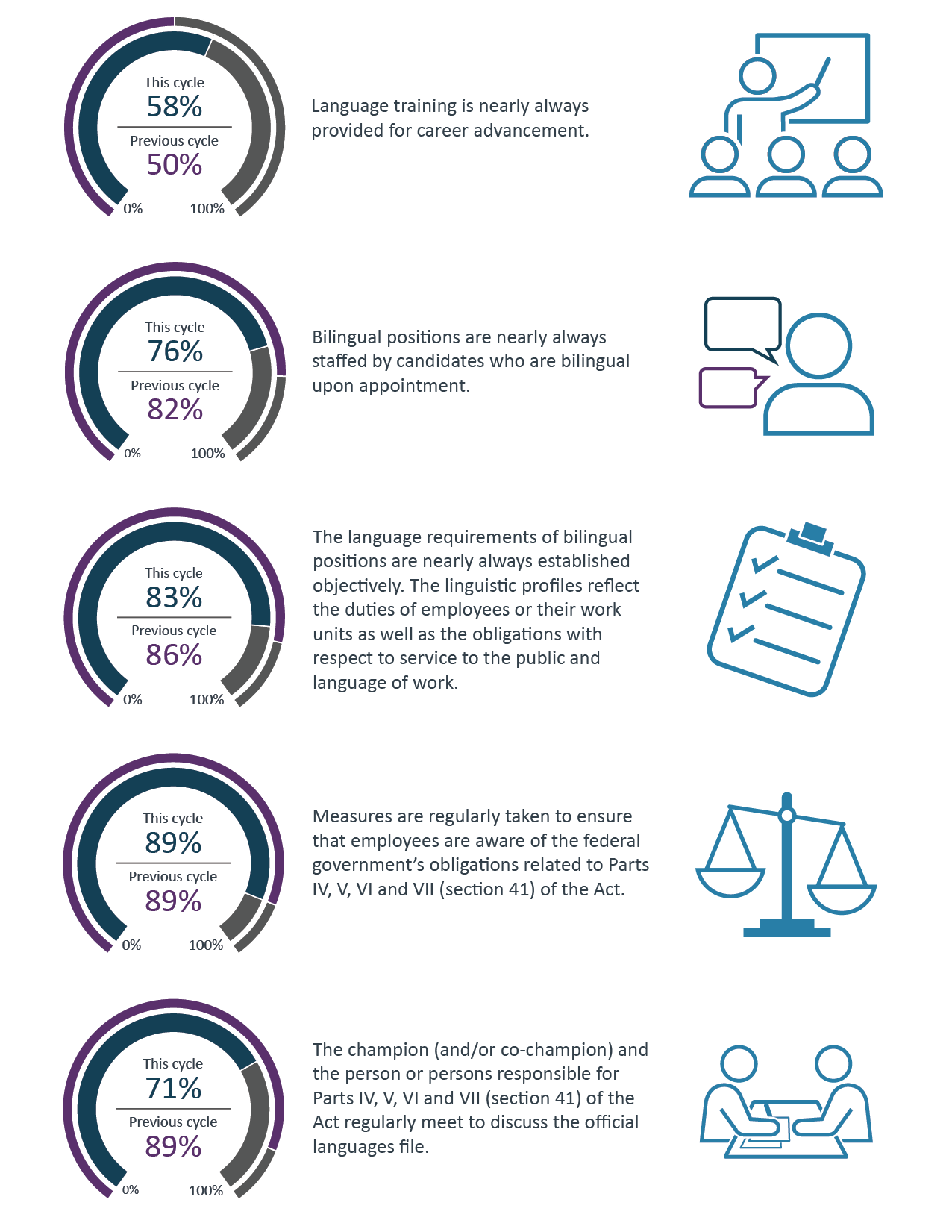 Chapter 2 shows that federal institutions focus on actions that will promote, within bilingual regions, a work environment that is truly conducive to the use of English and French. In particular, greater leadership is required to make federal employees feel comfortable using the language of their choice when writing or attending meetings. In a slightly different vein, institutions should focus on developing the second language skills that their employees would like to achieve.