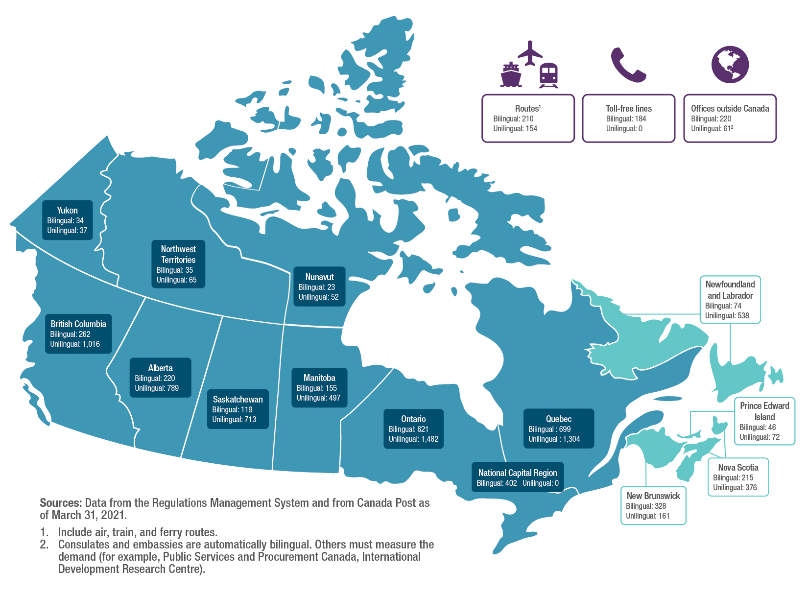 British Columbia: 262 bilingual offices, 1,016 unilingual; Alberta: 220 bilingual offices, 789 unilingual; Saskatchewan: 119 bilingual offices, 713 unilingual; Manitoba: 155 bilingual offices, 497 unilingual; Ontario: 621 bilingual offices, 1,482 unilingual; National Capital Region: 402 bilingual offices, none unilingual; Quebec: 699 bilingual offices, 1,304 unilingual; New Brunswick: 328 bilingual offices, 161 unilingual; Prince Edward Island: 46 bilingual offices, 72 unilingual; Nova Scotia: 215 bilingual offices, 376 unilingual; Newfoundland and Labrador: 74 bilingual offices, 538 unilingual; Yukon: 34 bilingual offices, 37 unilingual; Northwest Territories: 35 bilingual offices, 65 unilingual; Nunavut: 23 bilingual offices, 52 unilingual; Offices outside Canada: 220 bilingual, 61 unilingual (Consulates and embassies are automatically bilingual. Other offices must measure the demand (for example, Public Services and Procurement Canada, International Development Research Centre)); 184 bilingual toll-free lines, none are unilingual; Routes: 210 bilingual, 154 unilingual (include air, train and ferry routes). Sources: Data from the Regulatory Management System and from Canada Post as of March 31, 2021.