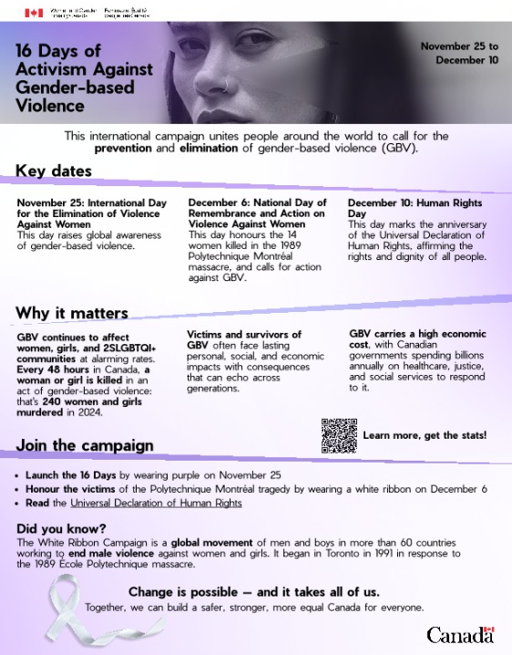The 16 Days of Activism Against Gender-based Violence (16 Days) is an annual international campaign, occurring from November 25 to December 10. This campaign began in 1991 to call out and speak up against gender-based violence (GBV), and to renew our commitment to ending violence against women, girls, and 2SLGBTQI+ communities.