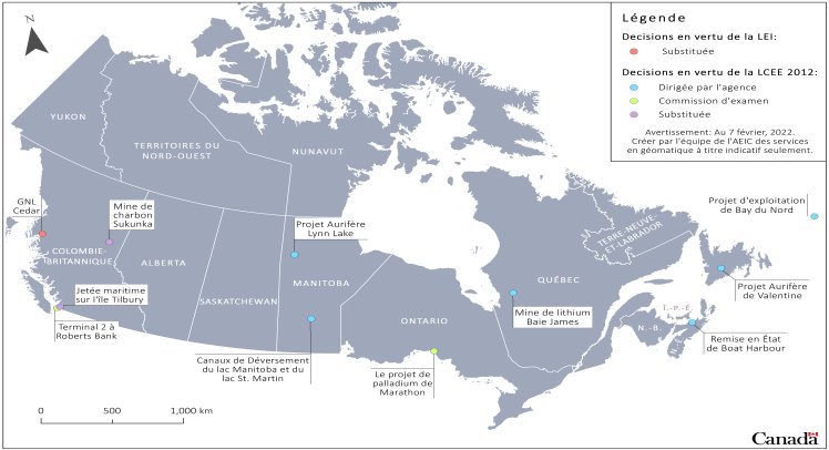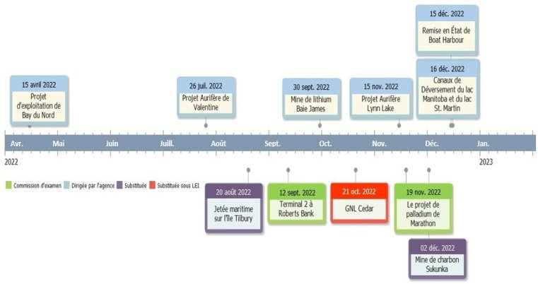 Carte du Canada et échéancier, décrivant les projets faisait l’objet d’une évaluation pour lesquels une décision du ministre est attendue dans les prochains neuf mois, soit :