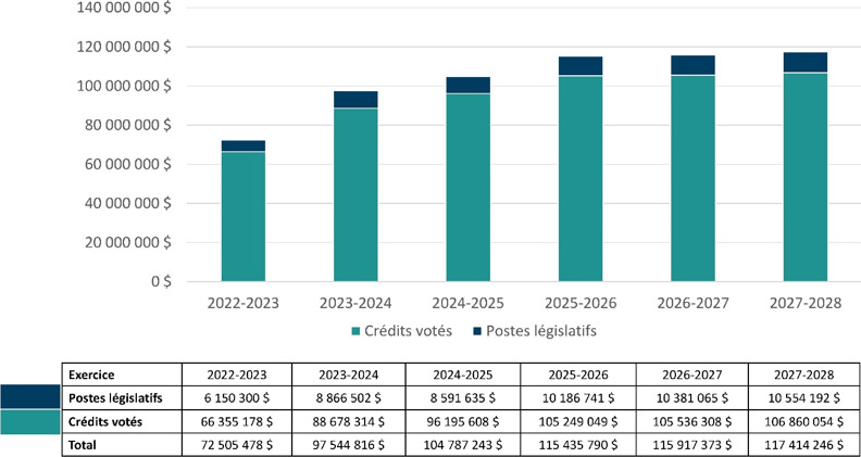 - Une liste qui recense tous les programmes du ministère et les ressources qui contribuent à l’exercice des responsabilités essentielles du ministère et à la réalisation de ses résultats.