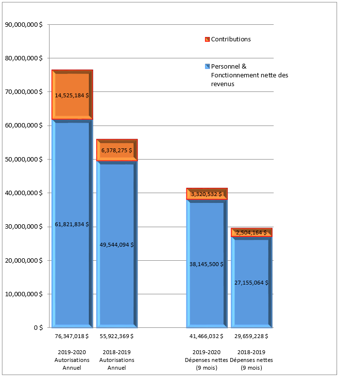 La figure 1 montre également que les dépenses budgétaires cumulatives après déduction des recettes de l'Agence pour le troisième trimestre ont augmenté de 11,81 M$ par rapport à l'exercice précédent (41,47 M$ en 2019-2020 et 26,66 M$ en 2018-2019).