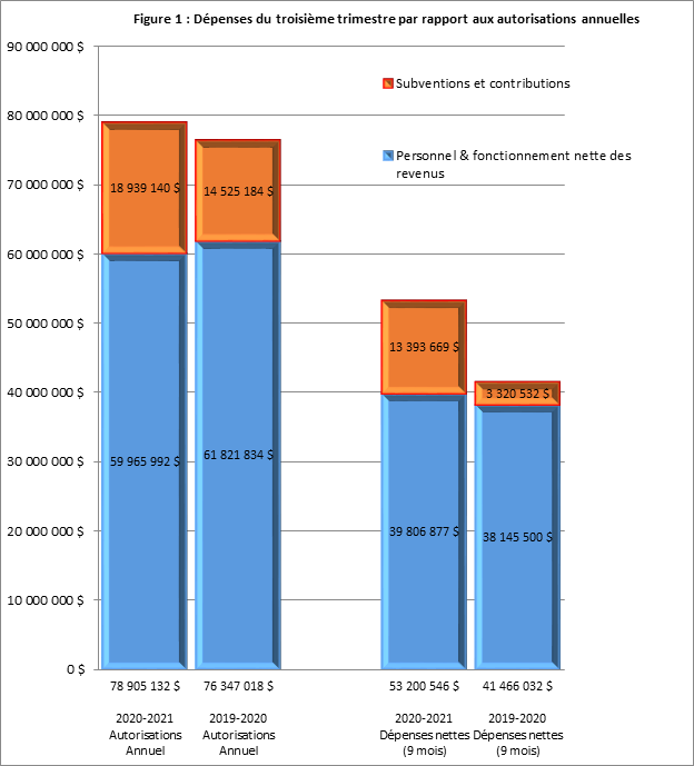 La figure 1 résume également que les dépenses budgétaires cumulatives, après déduction des recettes, de l'Agence pour le troisième trimestre ont augmenté de 11,73 M$ par rapport à l'exercice précédent (53,20 M$ en 2020-2021 et 41,47 M$ en 2019-2020). Les dépenses en subventions et contributions représentent une augmentation de 10,07 M$ (13,39 M$ en 2020-2021 et 3,32 M$ en 2019-2020). Ce changement est le résultat des efforts continus de l'Agence d'atteindre son mandat élargi.