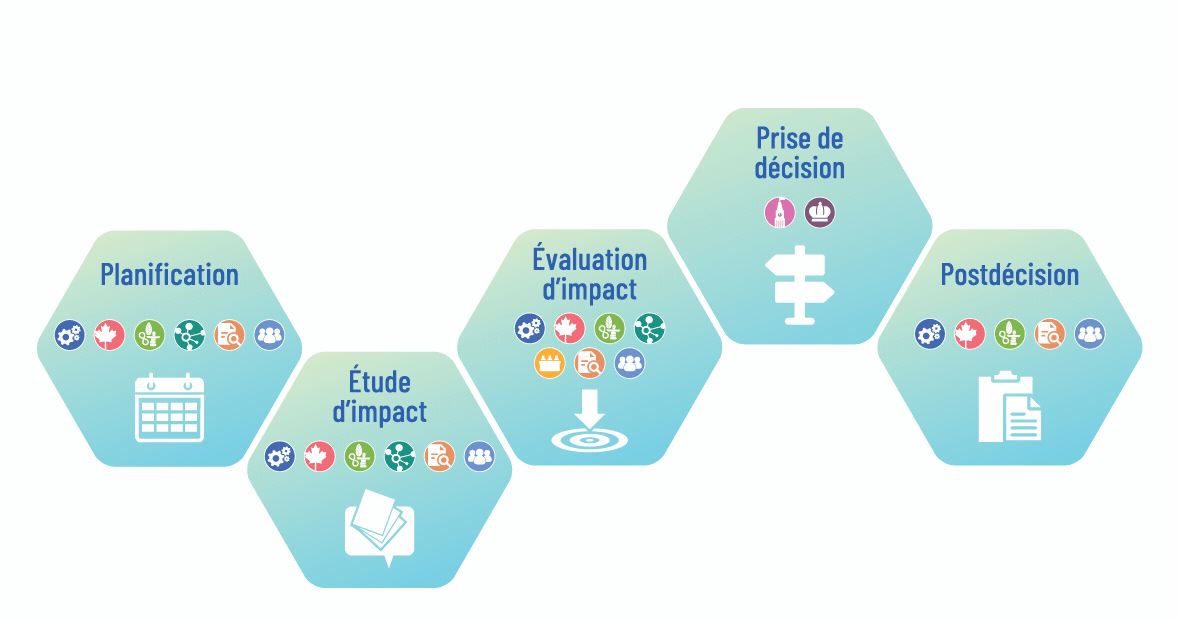 Avertissement : Cette page donne un aperçu en langage clair du processus d’évaluation d’impact. Elle ne remplace ni ne modifie la common law ou le droit civil, ni les obligations légales découlant de la Loi sur l’évaluation d’impact ou des règlements adoptés en vertu de celle-ci. En cas de contradiction entre ce contenu et la Loi sur l’évaluation d’impact ou les règlements adoptés en vertu de celle-ci, ce sont ces dernières qui prévalent.