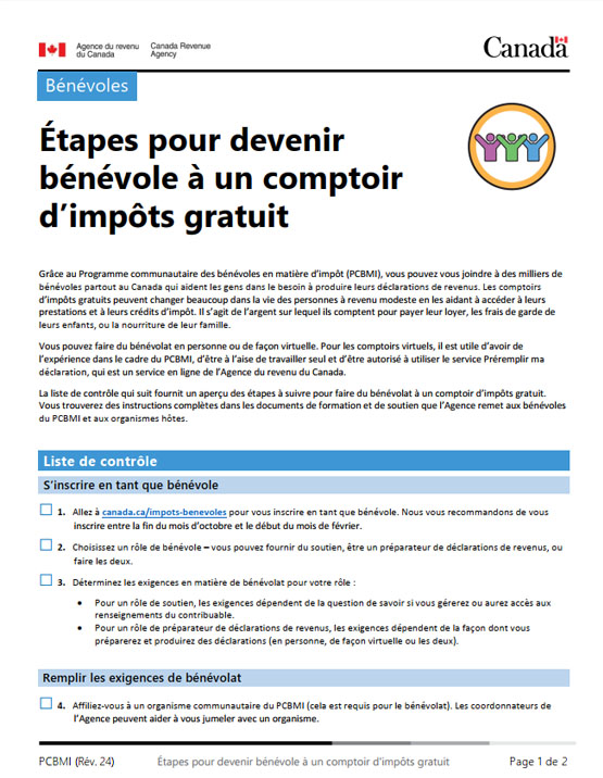 En tant que bénévole du Programme communautaire des bénévoles en matière d’impôt (PCBMI), vous participerez à des comptoirs d’impôts gratuits qui aident les particuliers admissibles à préparer leurs déclarations de revenus, afin qu’ils puissent obtenir les paiements de prestations et de crédits auxquels ils ont droit. Que vous prépariez des déclarations de revenus ou que vous remplissiez un rôle de soutien, votre contribution est importante. Si vous êtes un résident de la province de Québec et que vous souhaitez aider des particuliers à produire leur déclaration de revenus, veuillez consulter le site Web du Service d’aide en impôt – Programme des bénévoles.