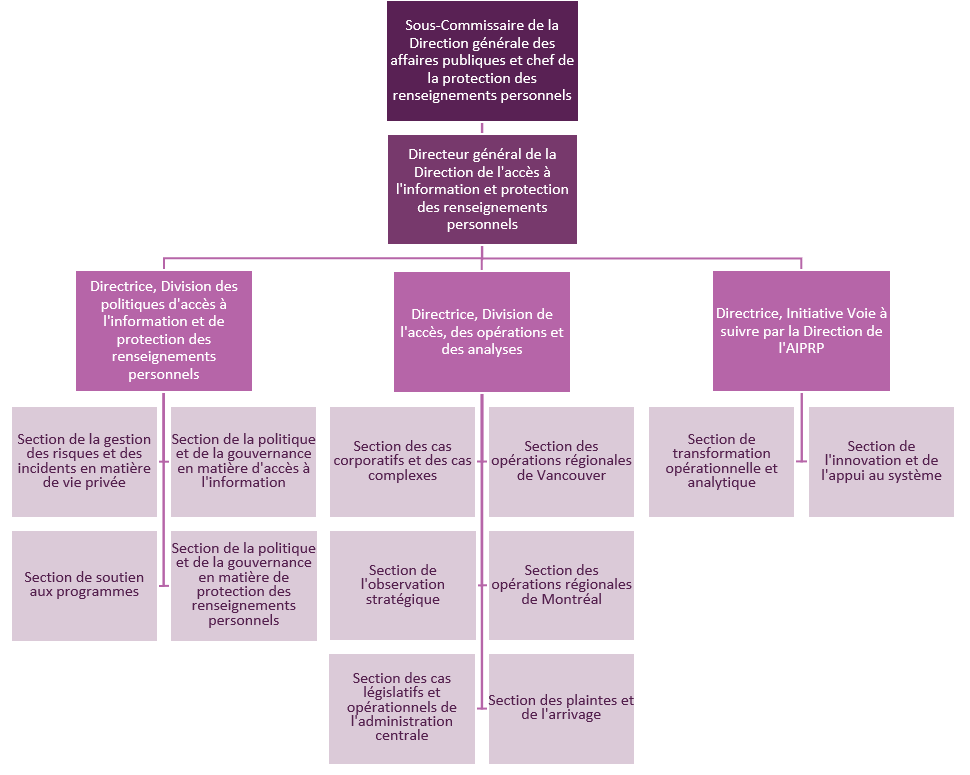 Premier domaine, la Division des politiques d’accès à l’information et de protection des renseignements personnels, deuxième domaine, la Division de l’accès, des opérations et des analyses, et le troisième domaine, l’Initiative Voie à suivre par la Direction de l’AIPRPLes quatre domaines suivants sont sous la responsabilité de la directrice de La Division des politiques d’accès à l’information et de protection des renseignements personnels: la Section de la politique et de la gouvernance en matière d’accès à l’information, la Section de la gestion des risques et des incidents en matière de vie privée, la Section de soutien aux programmes et la Section de la politique et de la gouvernance en matière de protection des renseignements personnels.