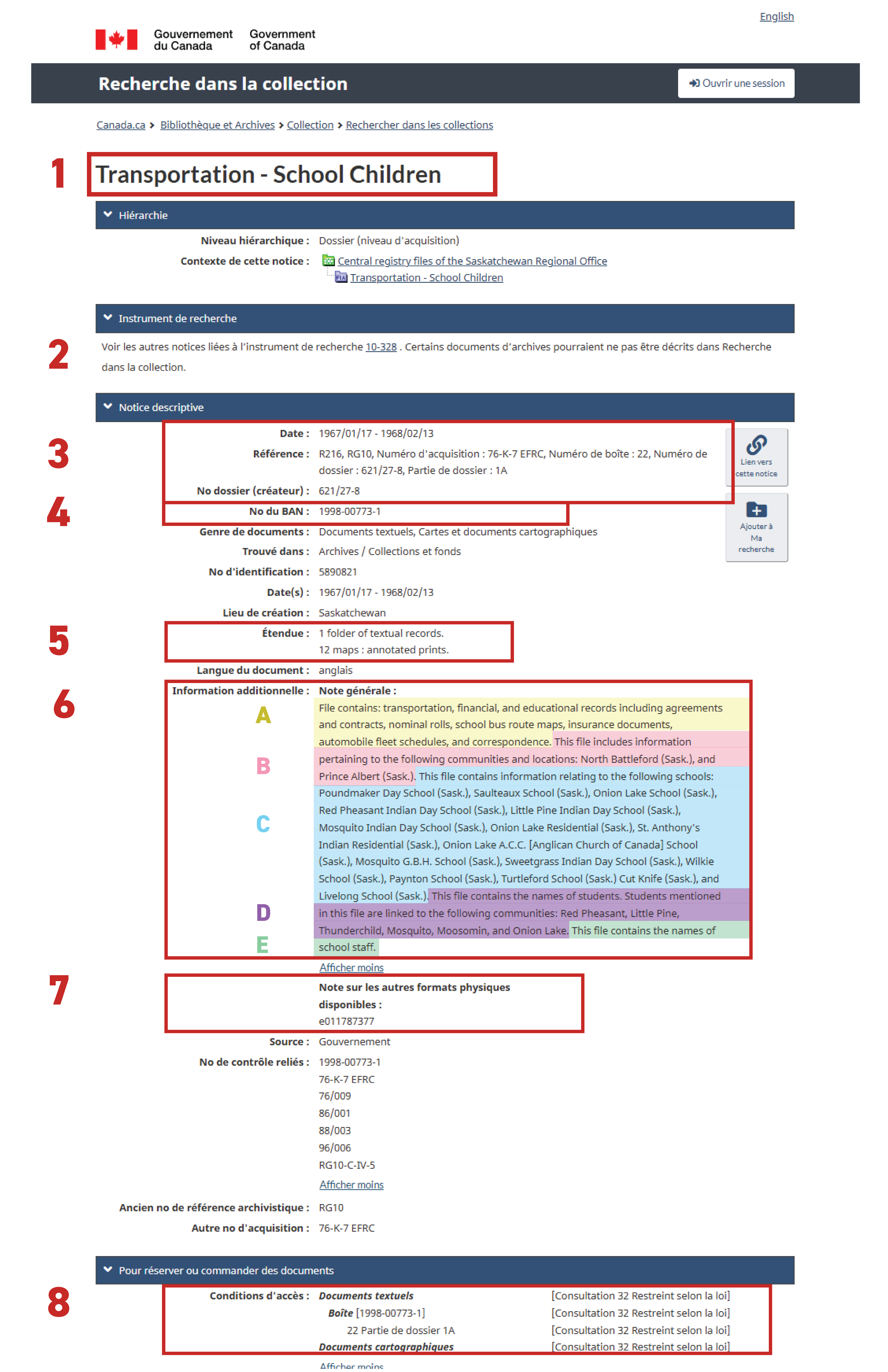 Ces sections comprennent les renseignements de référence nécessaires pour commander le matériel, par exemple R216, RG10, 1998-00773-1, boîte 22, numéro de dossier 621/27-8, partie de dossier 1A.