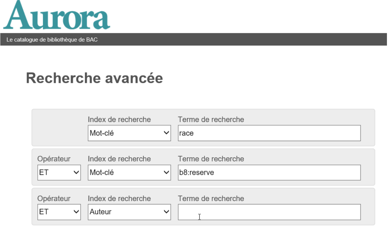 Cette image est une représentation visuelle de la recherche dans le catalogue de la bibliothèque de BAC appelée Aurora. Voici l'écran de recherche avancée. Il y a trois rangées d'options.