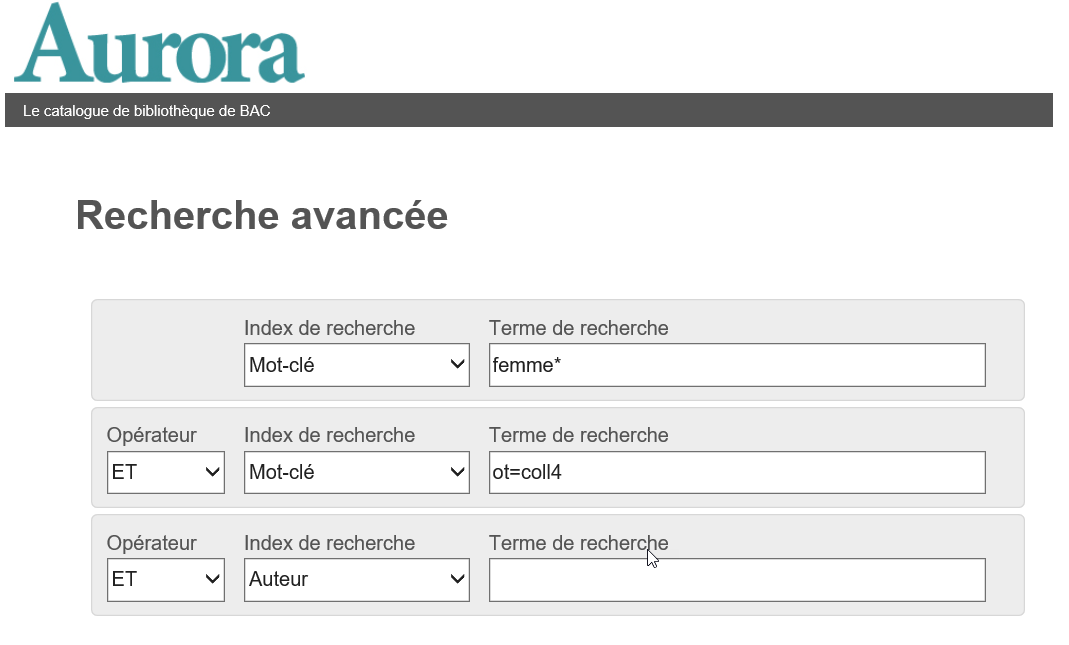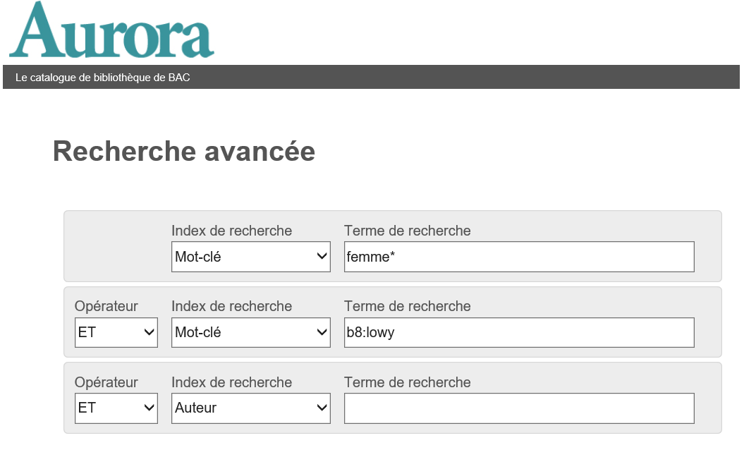 Cette image est une représentation visuelle de la recherche dans le catalogue de la bibliothèque de BAC appelée Aurora. Voici l'écran de recherche avancée. Il y a trois rangées d'options.