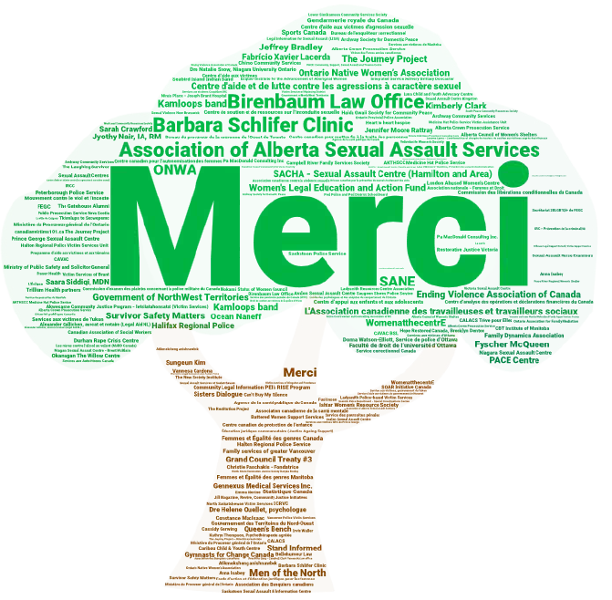 Merci aux survivant.e.s de partout au Canada qui nous ont fait confiance pour les écouter. Vos voix sont fortes et vous méritez d’être traités avec dignité et respect.
