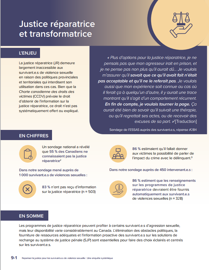 - 86 % estiment que les renseignements sur les programmes de justice réparatrice devraient être fournis automatiquement aux survivant.e.s de violences sexuelles