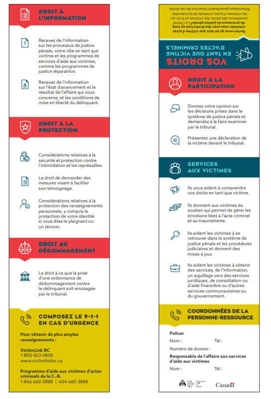 Exemple de carte recto verso sur les droits des victimes préparée pour les agents de police par la GRC de la Colombie-Britannique (2019)