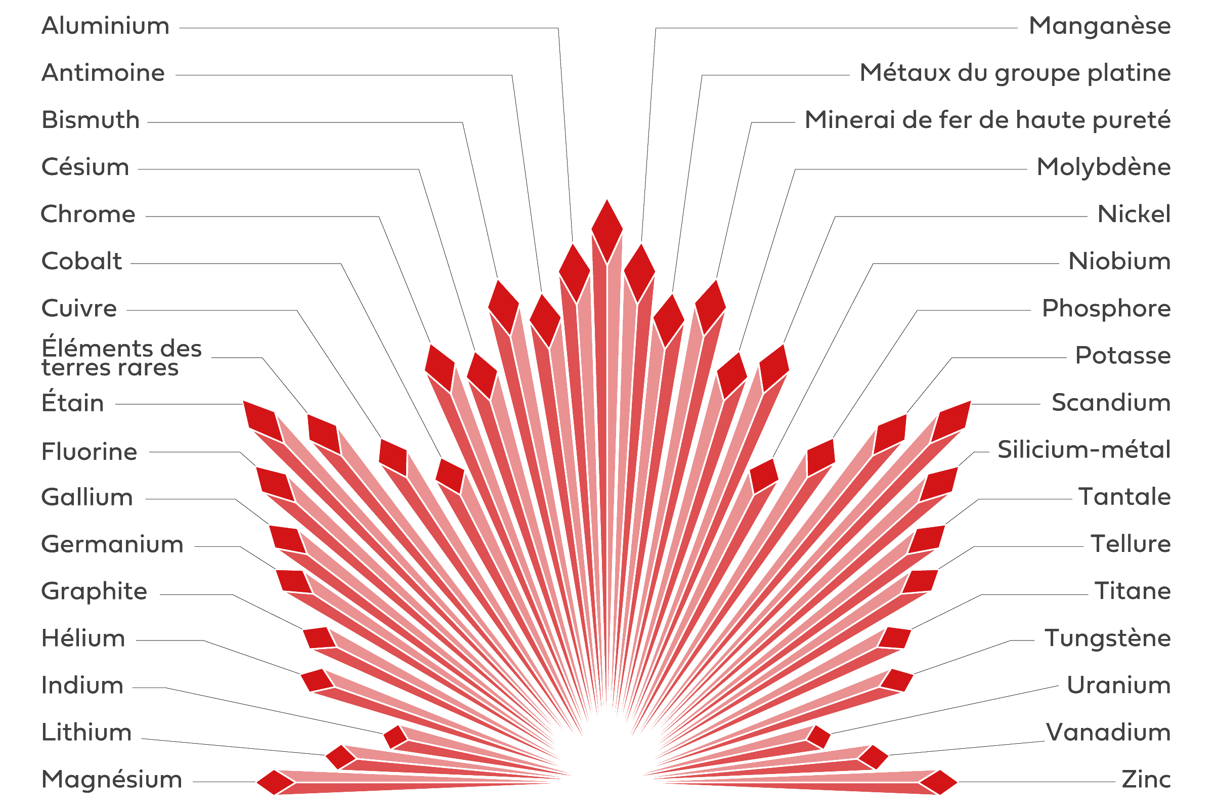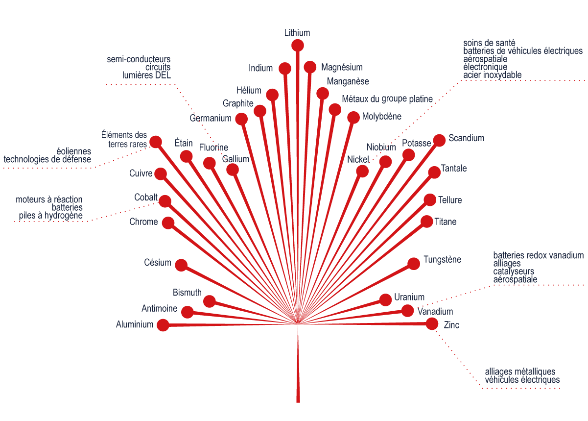 Liste de 34 minéraux critiques, en forme de feuille d’érable. Voici les 34 minéraux critiques :