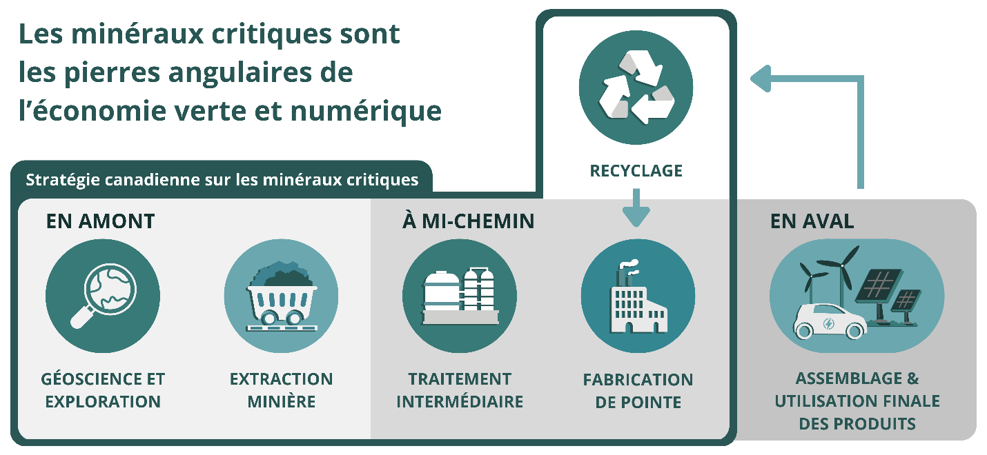 La liste des minéraux critiques du Canada appuie trois principales chaînes de valeur décrites dans la Stratégie canadienne sur les minéraux critiques :