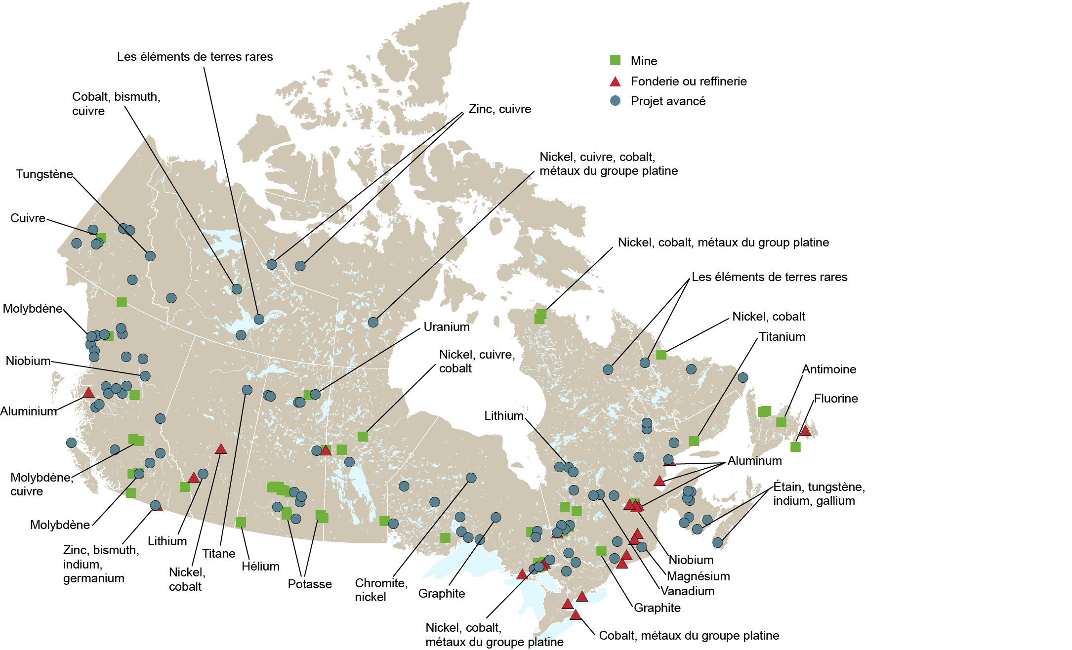 Les mines, les usines de fusion, les affineries et les projets avancés de minéraux critiques sont situés dans toutes les provinces et tous les territoires du Canada, à l’exception de l’Île-du-Prince-Édouard.