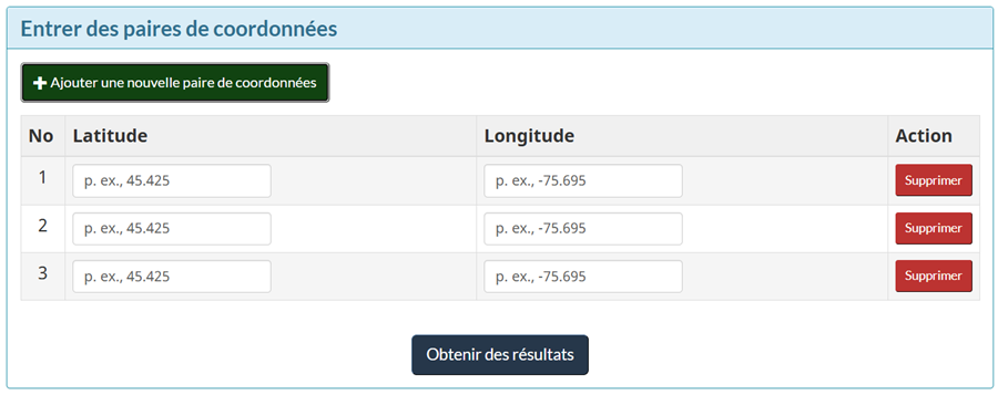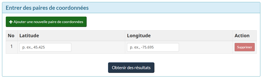 Entrez une seule paire de coordonnées* dans les champs Latitude et Longitude et sélectionnez Obtenir des résultats.