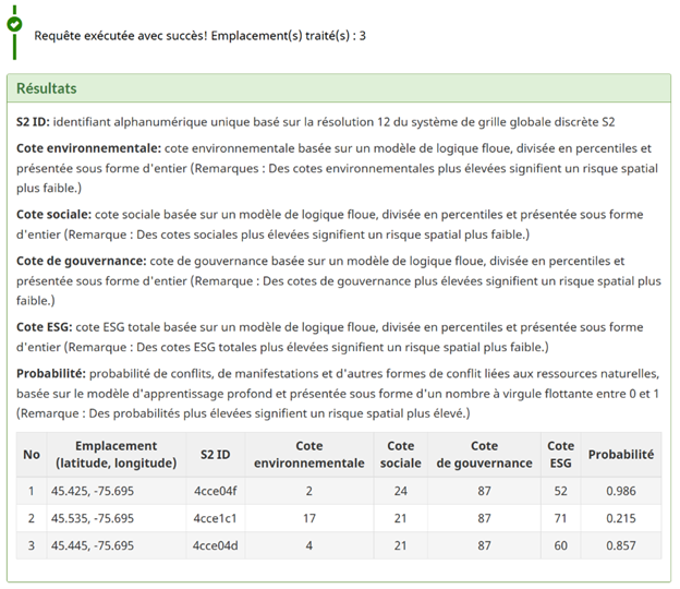 Pour les développeurs intéressés par l’accès à l’aide de programmes, nous avons préparé un carnet de démonstration exhaustif présentant des exemples d’intégration d’interfaces de programmation d’applications (API). Le carnet est disponible dans notre répertoire GitHub : https://github.com/NRCan/Geospatial_ESG_Model