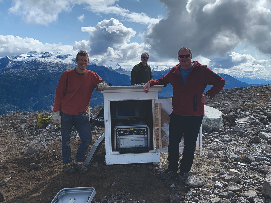 Sur la photo, Jan Dettmer (à gauche), l’étudiant au doctorat Pejman Shahsavari (au milieu) et un partenaire de l’industrie, Jason France (à droite) d’OptaSense, installent un capteur à fibre optique de pointe sur une montagne recouverte de glaciers pour détecter les évènements de déformation. Photo : Carson Laing, OptaSense