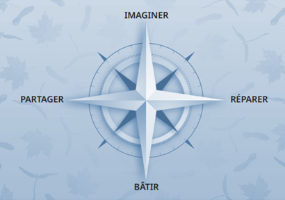 Une boussole à quatre points et un plan de travail : « Imaginer, Réparer, Bâtir, Partager »