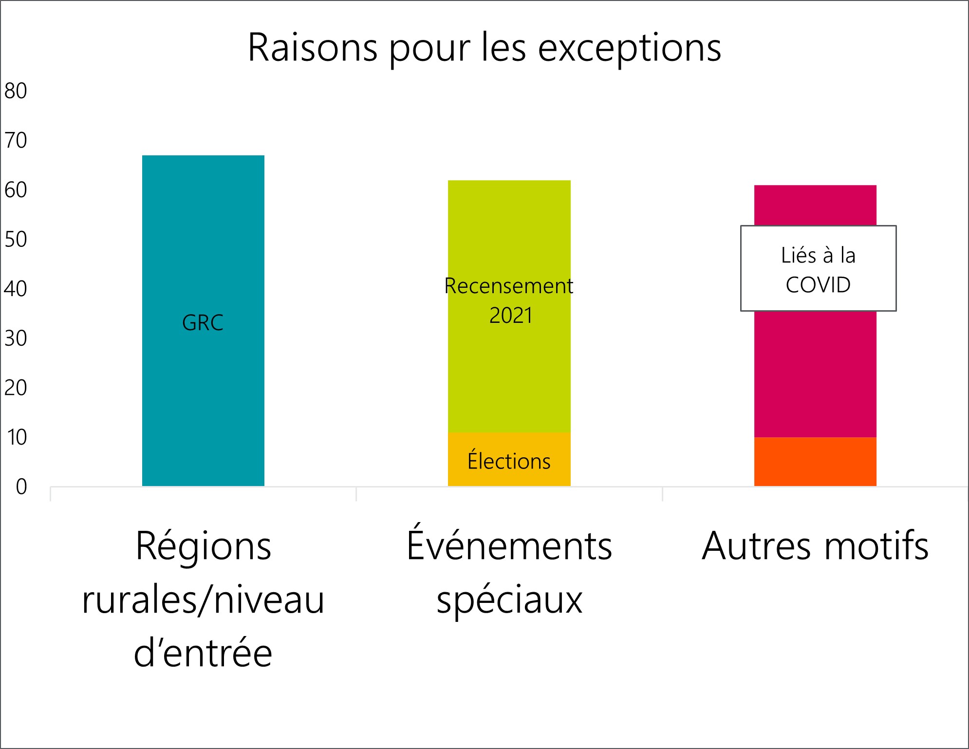 - Bien qu’il y ait une augmentation significative d’une année à l’autre des exceptions, elles sont principalement attribuables à la COVID-19 et à des événements isolés (recensement et élections fédérales).