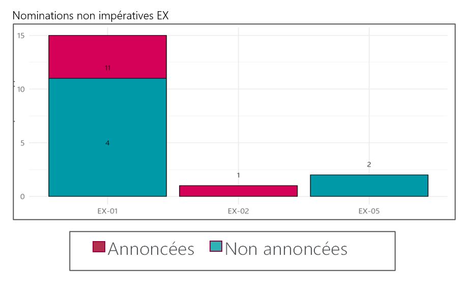 Au total, 445 nominations non impératives ont été faites (18 EX, 427 non-EX), ce qui représente une hausse considérable par rapport aux données recueillies au cours des 10 dernières années.