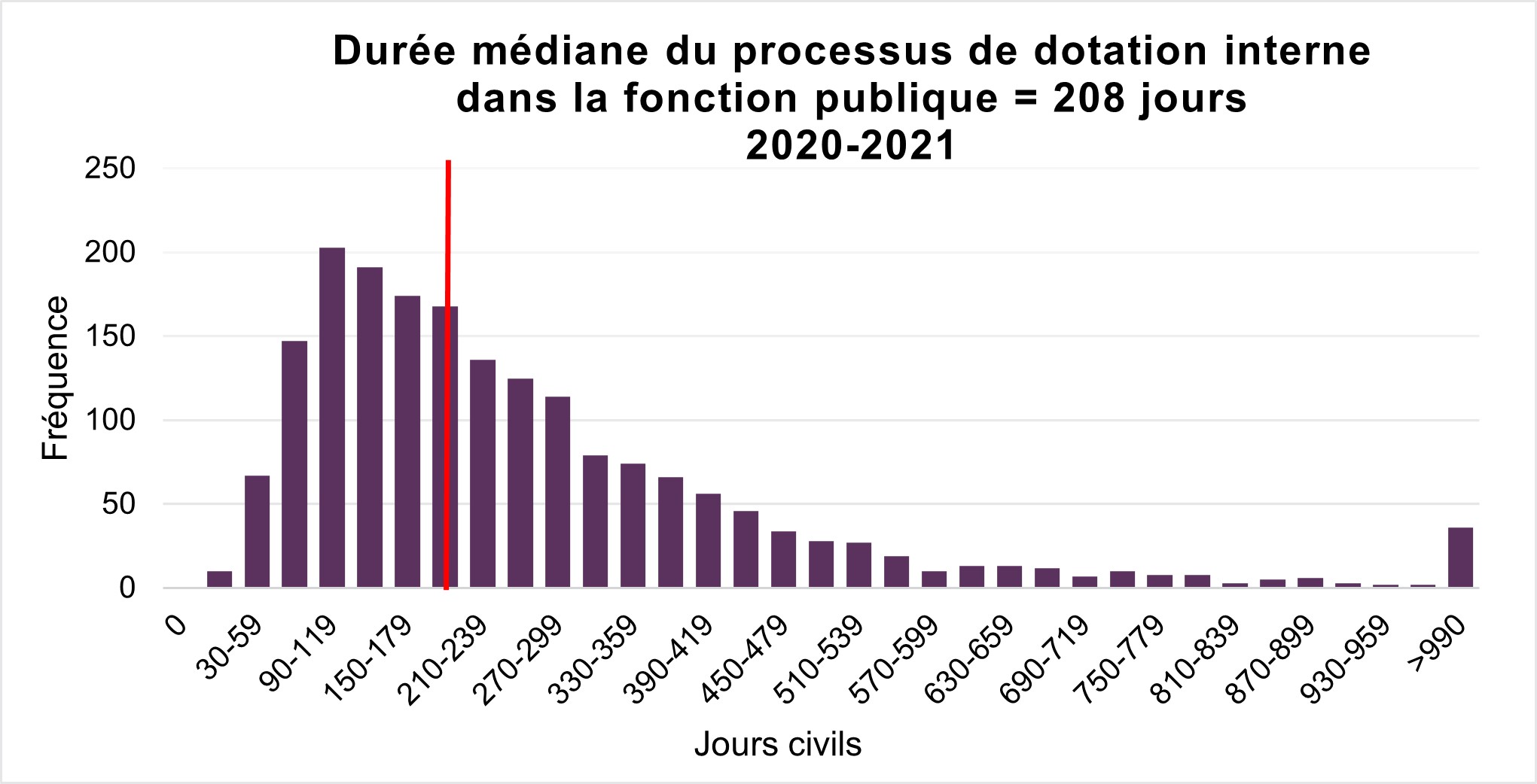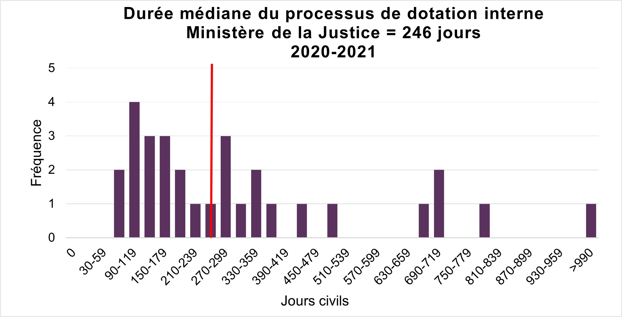 La durée médiane du processus de dotation interne pour la fonction publique (organisations assujetties à la Loi sur l’emploi dans la fonction publique) pour l’exercice financier 2020-2021 est 208 jours. La durée médiane de dotation interne au Ministère de la Justice pour l’exercice financier 2020 à 2021 est 246 jours.