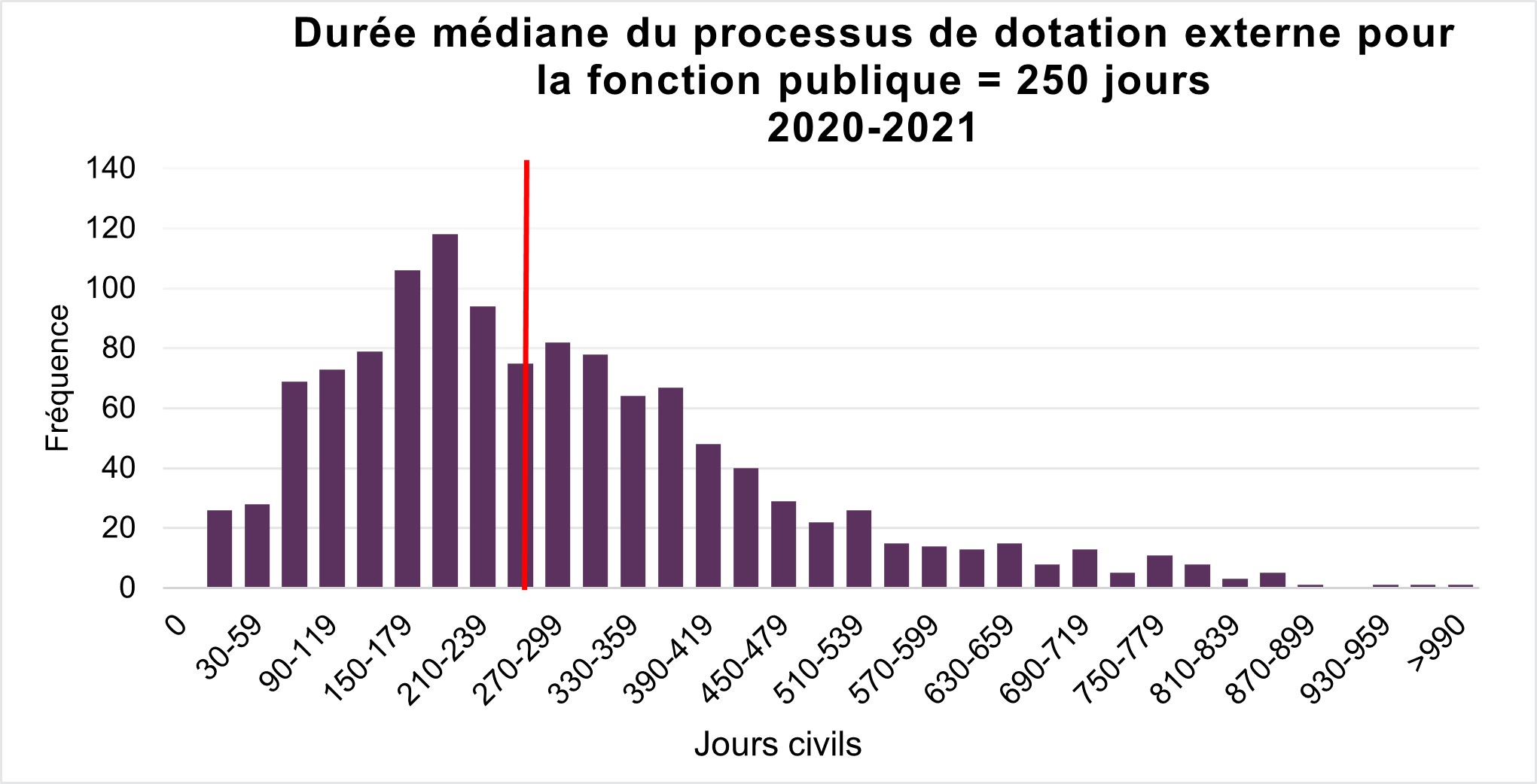 La durée médiane du processus de dotation externe pour la fonction publique (ministères et organismes assujettis à la Loi sur l’emploi dans la fonction publique pendant l’exercice financier 2020-2021 est de 250 jours. Les données sont insuffisantes pour fournir des résultats sur la durée du processus de dotation externe au Ministère de la Justice.