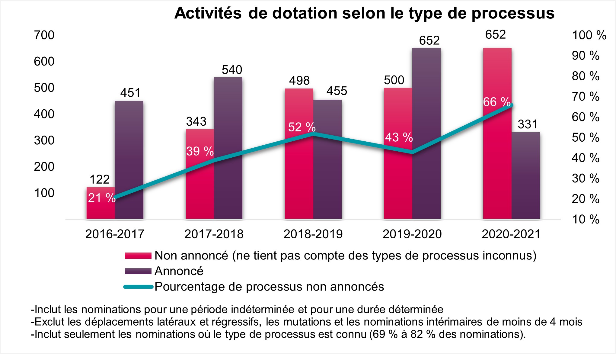 - Seules les nominations à des postes de durée déterminée et les nominations à des postes pour une période indéterminée sont prises en compte (à l’exclusion des mutations, nominations occasionnelles et nominations intérimaires).