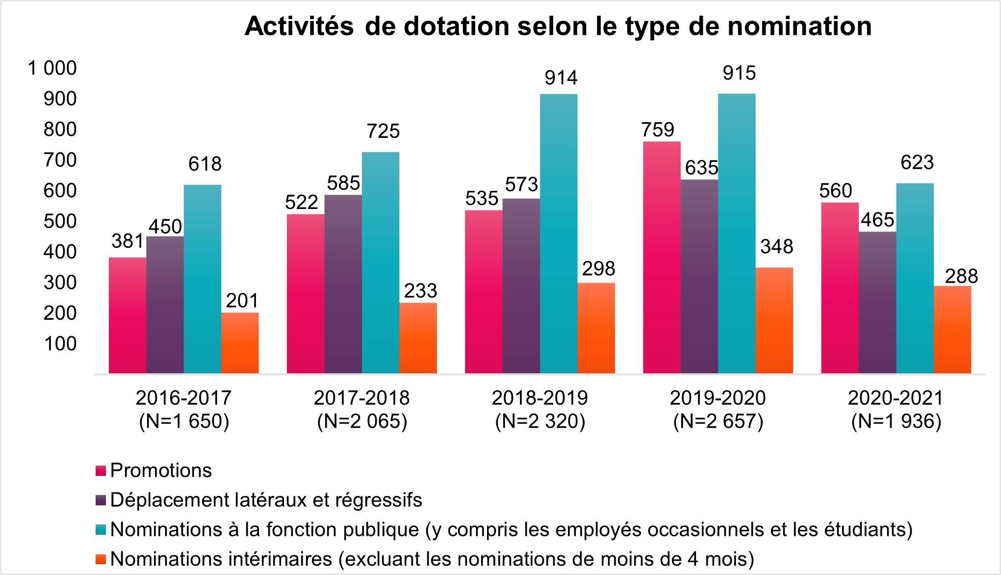 - 623 nominations à la fonction publique (incluant employés occasionnels et étudiants);